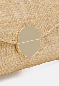 Pochette beige tissée en matériau texturé avec fermeture à rabat, ornée d'un accent circulaire doré et d'une bandoulière chaîne.