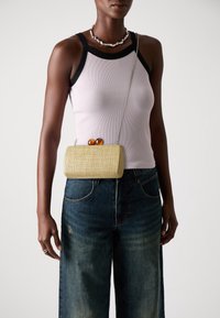 Femme portant un débardeur blanc bordé de noir, un jean large en denim, un collier en nacre et un petit sac bandoulière beige tissé avec un fermoir en ambre.