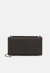Pochette en maille métallique noire de forme rectangulaire, avec une chaîne et un motif en grille sobre. Elle dispose d'une fermeture en haut pour un accès sécurisé.