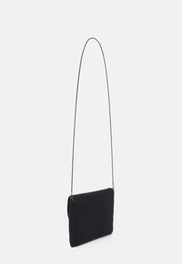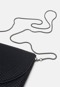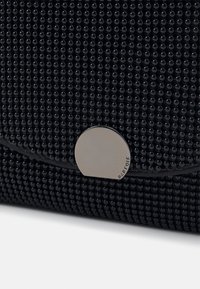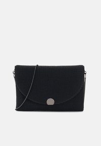 Pochette rectangulaire noire avec extérieur texturé, fermeture à rabat, fine bandoulière et petit bouton métallique rond au centre avant.