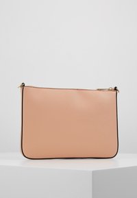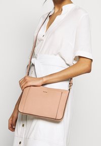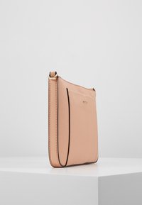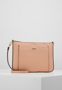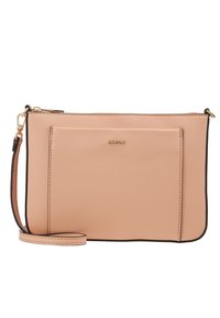 Sac bandoulière de couleur pêche avec une texture lisse, des ferrures dorées et une fermeture éclair. Comprend une poche avant et une fine sangle ajustable.