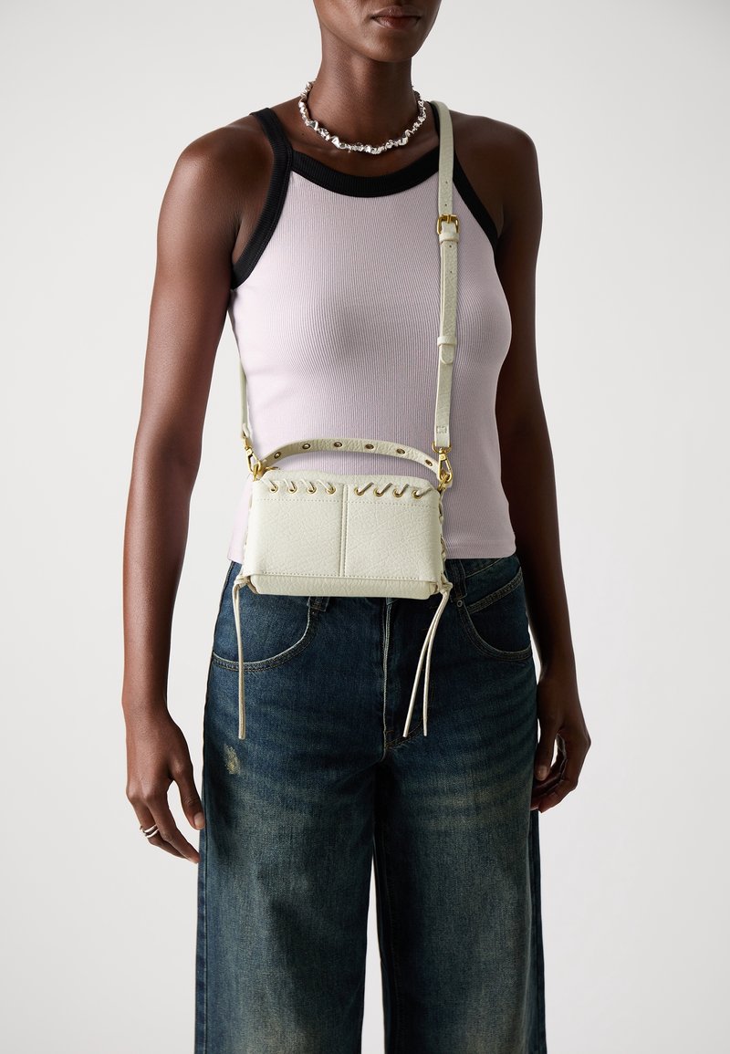 Femme portant un débardeur lilas avec des bordures noires, un jean large de couleur foncée, un sac à épaule blanc avec des ferrures dorées, et un collier argenté imposant.
