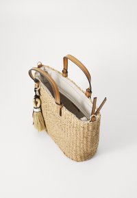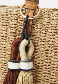 Femme portant un haut sans manches et un jean, tenant un sac à main en paille tressée avec des poignées en cuir et des breloques à pampilles, porté en bandoulière.