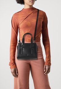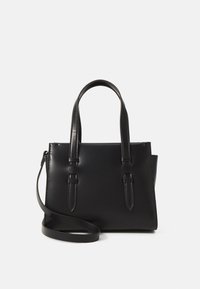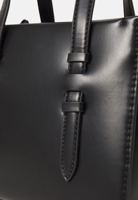 Sac à main en cuir noir avec deux poignées supérieures, une bandoulière amovible et des détails cousus. Forme rectangulaire avec un design minimaliste.