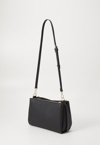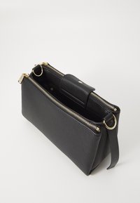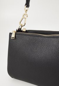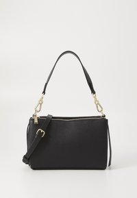 Sac à main en cuir noir avec une finition texturée, doté d'une bandoulière amovible et de quincaillerie dorée. Porté avec des bottes à talons marron.