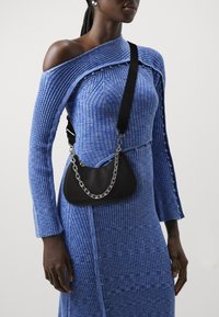Sac à main noir avec une bandoulière en chaîne, associé à une robe bleue côtelée avec un design décoletté et des accents de boutons.