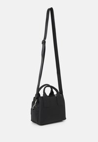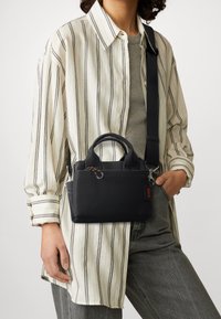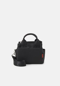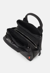Sac fourre-tout noir en matériau doux, avec deux poignées supérieures, une bandoulière amovible, une fermeture éclair et un petit logo rouge sur le côté.