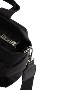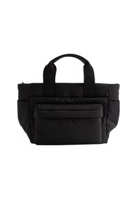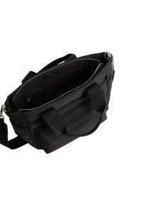 Sac cabas matelassé noir avec deux poignées robustes, une poche avant et une fermeture éclair. Le matériau semble lisse et résistant à l'eau.
