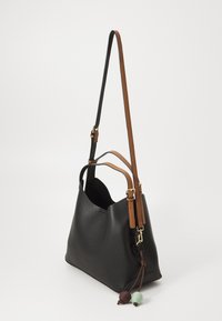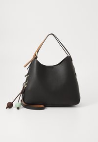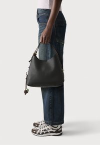 Sac hobo en cuir noir à texture lisse, silhouette incurvée et breloque amovible, tenu par une personne portant un jean bleu et des baskets.