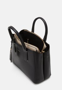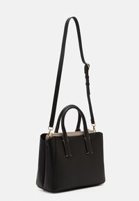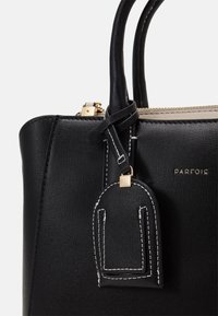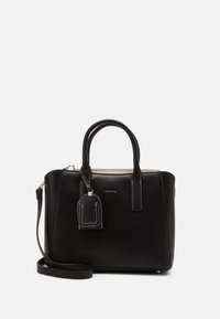 Sac à main synthétique noir à forme structurée, avec double poignée, bandoulière réglable et surpiqûres blanches contrastantes. Comprend une étiquette de bagage.