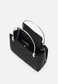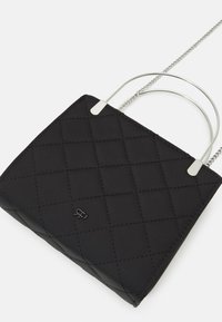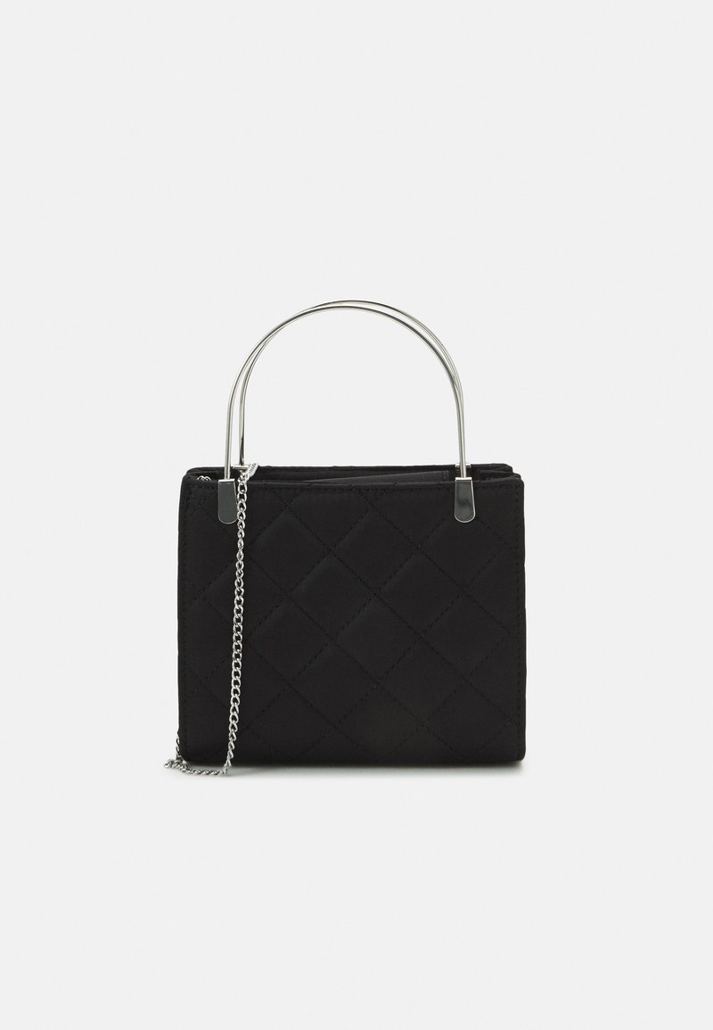 Sac à main matelassé noir avec poignées en métal argenté et une bandoulière chaîne en argent sur un fond uni.