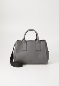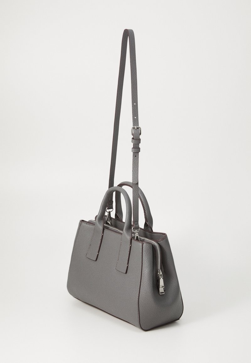 Sac à main en cuir gris à texture grainée, avec fermeture éclair, deux poignées supérieures et une bandoulière amovible. Forme rectangulaire avec coutures visibles.