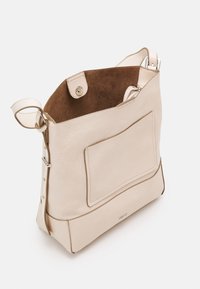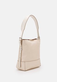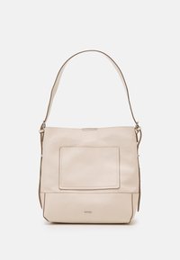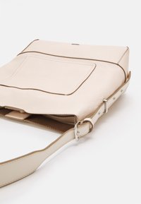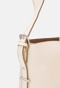 Sac à épaule en cuir couleur crème avec une large sangle unique et une poche avant à glissière, présenté sur un fond blanc uni.