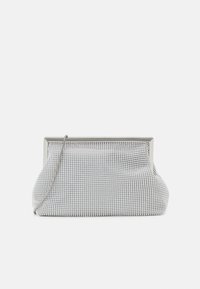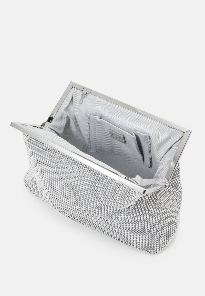 Pochette en maille argentée avec une armature métallique, un intérieur en tissu lisse et une poche zippée. Dispose d'un extérieur texturé orné de perles.