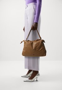 Sac à bandoulière en cuir marron avec un design doux et décontracté, des accents noués et une bandoulière réglable pour plus de confort lors du transport.