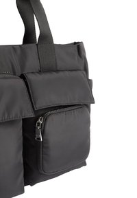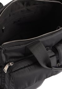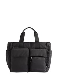 Sac en toile noir avec deux poches avant, l'une avec zip, des anses robustes et un design rembourré. Texture lisse avec une forme simple.