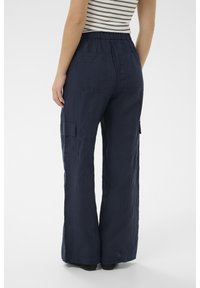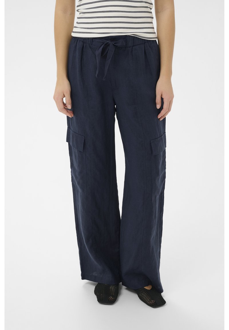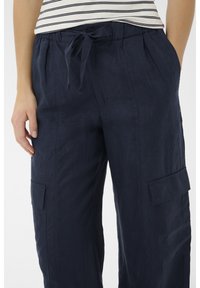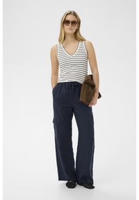 Personne portant un pantalon cargo large bleu marine à taille nouée sur le devant et une chemise blanche à manches courtes à rayures, associée à des chaussures noires sans lacets.