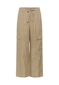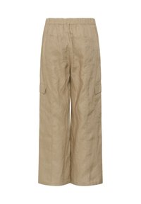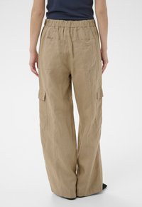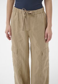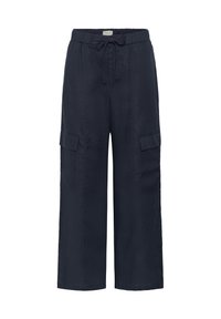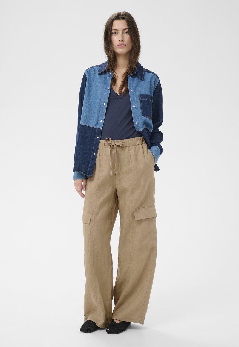 Femme portant une chemise en denim color-block, un haut bleu marine, un pantalon beige à jambes larges avec poches, et des chaussures noires, debout devant un fond blanc uni.
