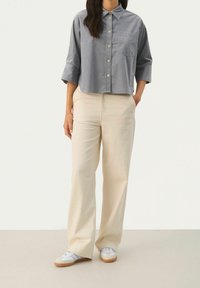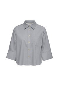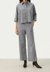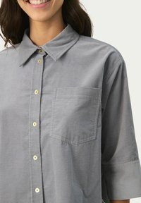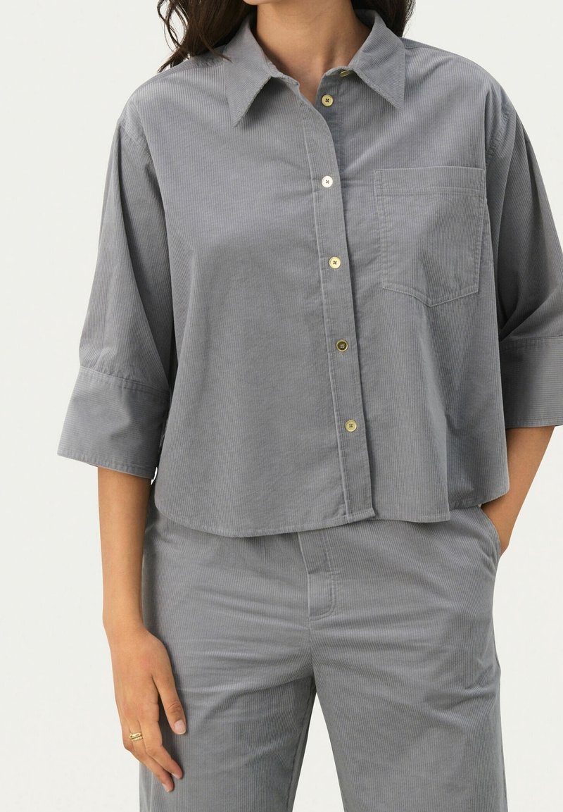 Chemise en velours côtelé gris avec col, coupe oversize, fermeture à boutons, poche poitrine unique et manches retroussables. Texture douce avec des rayures verticales.