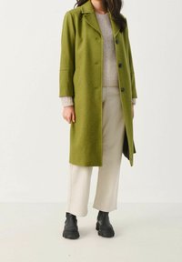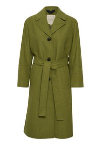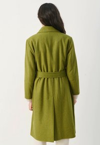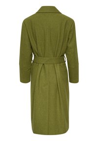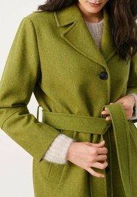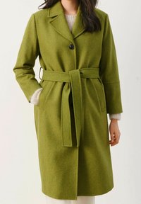 Manteau en laine vert avec ceinture, col tailleur, un bouton noir unique et poches latérales. La texture est lisse avec une légère brillance.