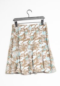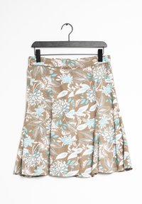 Jupe marron avec motif floral blanc et turquoise suspendue à un cintre noir sur fond blanc.