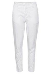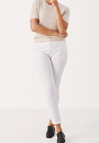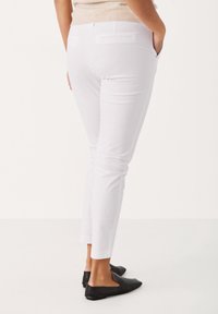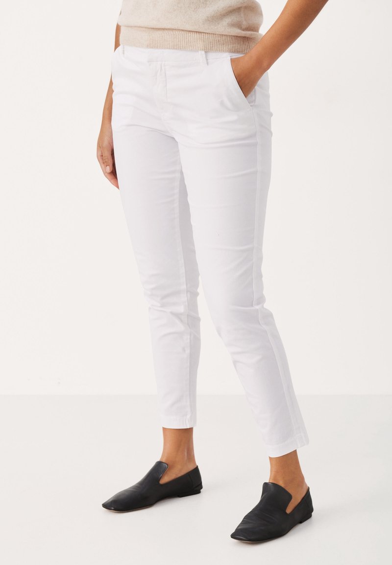 Pantalon en coton blanc avec une coupe slim et des poches latérales, présentant une texture lisse et une coupe longueur cheville. Associé à des chaussures noires sans lacets.