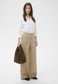 Femme portant un pantalon large beige avec des poches, associé à une chemise blanche boutonnée et des chaussures noires en maille ouverte.