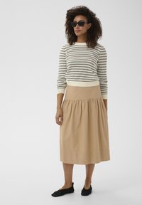 Femme aux cheveux bouclés portant un pull blanc à rayures noires et une jupe beige, debout devant un fond clair uni.