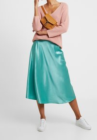 Femme portant un pull en maille rose à col en V et manches trois-quarts, associé à une jupe en satin turquoise, debout devant un fond blanc.