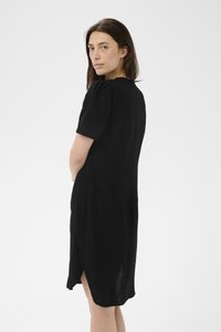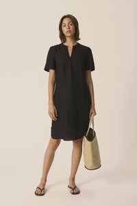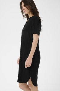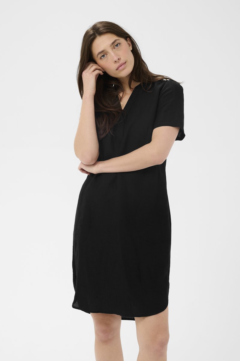 Femme aux longs cheveux bruns portant une robe noire à manches courtes, debout avec un bras croisé et l'autre main touchant ses cheveux.