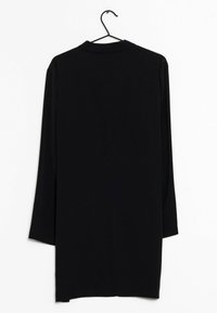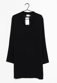 Tunique noire à manches longues avec un col en V, une texture lisse et une étiquette attachée. Suspendue à un crochet noir sur un fond blanc.