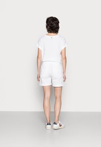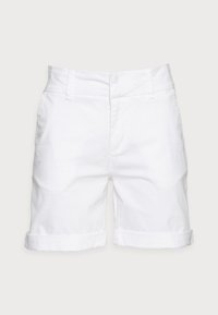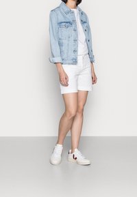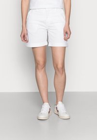 Shorts blancs en coton avec ourlets roulés, présentant un devant plat et des poches latérales. Assortis de baskets blanches avec des accents rouges.
