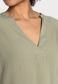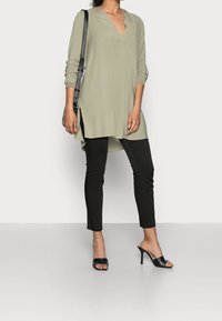 Femme portant une tunique ample à manches longues de couleur vert olive clair avec un col en V et des poignets élastiques, associée à un pantalon noir.