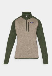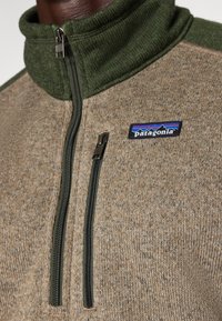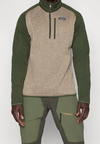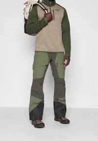 Homme portant une polaire zippée avec des manches vertes et un torse beige, assortie à un pantalon cargo vert olive avec plusieurs poches.