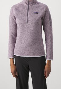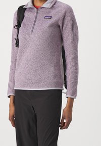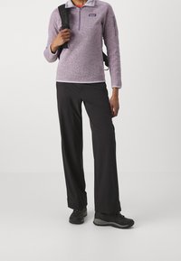 Pull polaire violet clair avec col montant et fermeture éclair avant. Étiquette logo attachée sur la poitrine. Associé à un pantalon cargo kaki.
