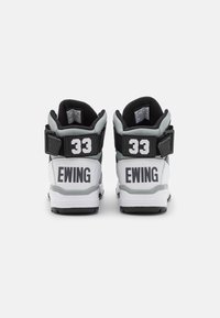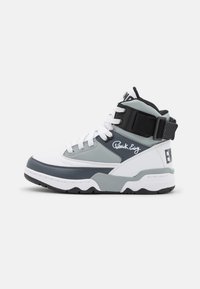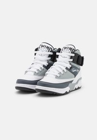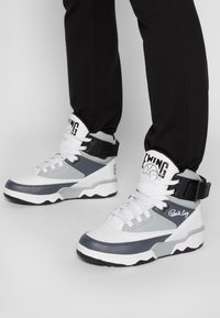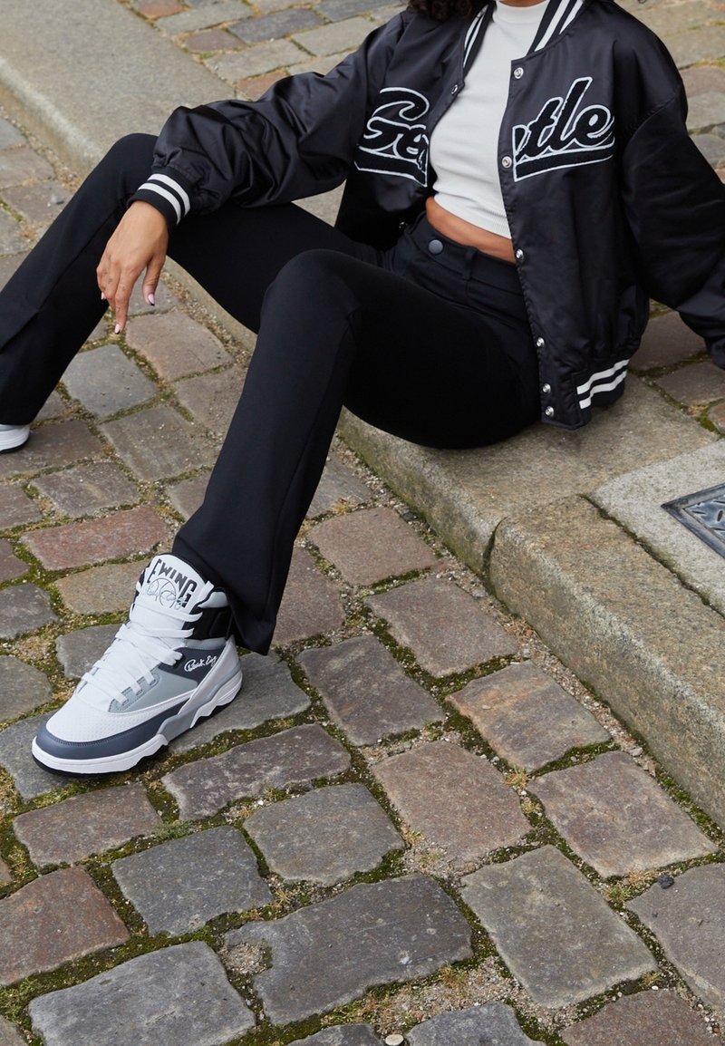Personne assise sur un trottoir portant un pantalon noir, un crop top blanc, une veste noire avec le texte "Seattle", et des baskets montantes blanche et grise sur une rue pavée.