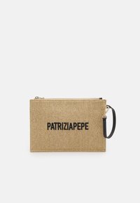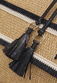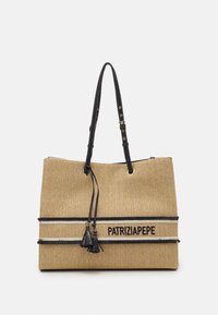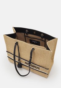 Sac cabas beige en tissu tissé avec poignées en cuir noir et pompons, accompagné d'une pochette zippée assortie, tous deux étiquetés "PATRIZIA PEPE."