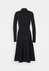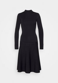 Haut noir ajusté à manches longues avec col montant, associé à une jupe midi noire évasée, sur fond blanc uni.