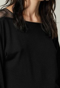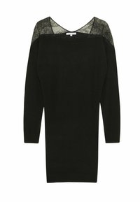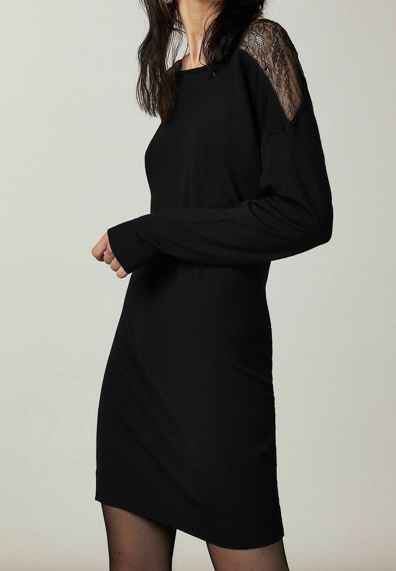 Robe noire en tissu maille douce, avec manches longues, accents de dentelle aux épaules et silhouette ajustée avec ourlet côtelé.
