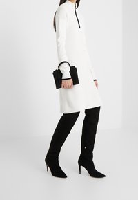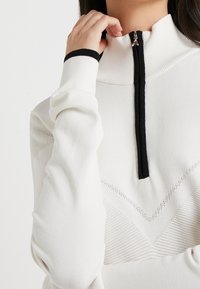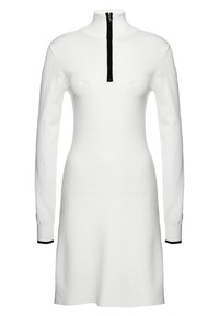 Robe en tricot blanche à manches longues avec un col montant et une fermeture éclair noire, présentant un motif chevron subtil et des poignets noirs contrastants. Portée avec des cuissardes noires.