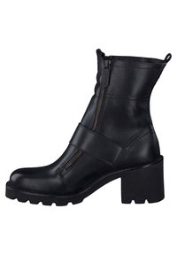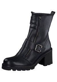 Bottine en cuir noir avec un talon épais, comprenant des fermetures éclair latérales, une bride avec une boucle argentée et une finition texturée.