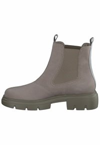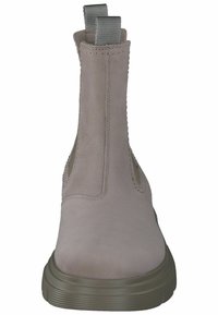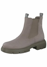 Bottines beiges avec panneaux latéraux élastiques, dessus texturé et semelle extérieure en caoutchouc épaisse. Boucle à l'arrière pour faciliter l'enfilage.