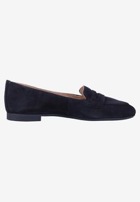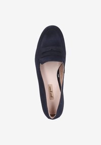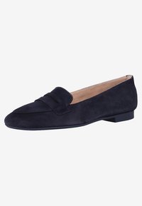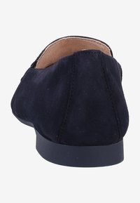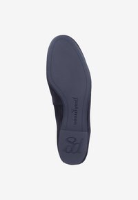 Chaussure plate en daim marine avec un bout pointu, dotée d'une petite sangle décorative sur le cou-de-pied et d'une semelle en caoutchouc noire minimaliste.