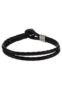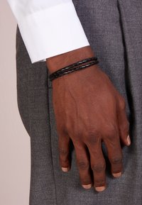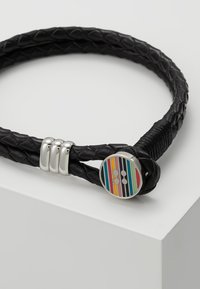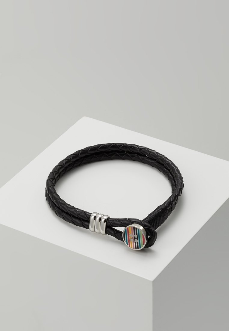 Bracelet en cuir tressé noir avec fermoir en argent, présentant un détail bouton rond multicolore à rayures, exposé sur un piédestal géométrique blanc.
