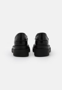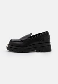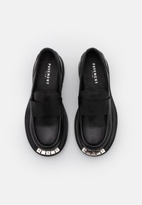 Mocassins en cuir noir à semelles épaisses et plateforme, avec détail en métal argenté, portés pieds nus sur fond blanc.