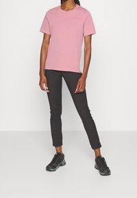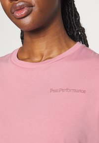 Personne portant un t-shirt rose uni à manches courtes avec le logo "Peak Performance" sur la poitrine et un pantalon noir, debout devant un fond uni.