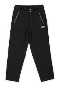 Pantalon cargo noir en tissu léger, avec des poches latérales et un léger éclat. Associé à des baskets blanches pour un contraste.