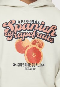 Hoodie beige avec texte graphique "Original Spanish Grapefruit" et illustration de pamplemousse tranché, assorti à un pantalon crème texturé.