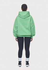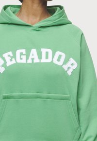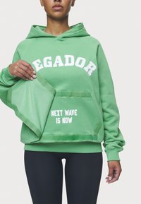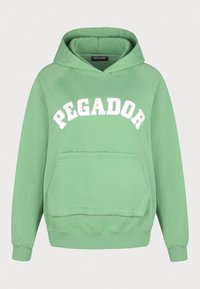 Sweat à capuche vert avec poche avant et inscription blanche "PEGADOR". Il présente une coupe décontractée, une capuche avec cordon de serrage et des poignets côtelés.