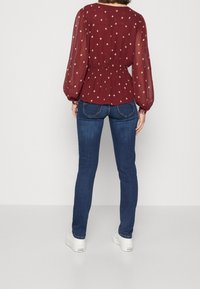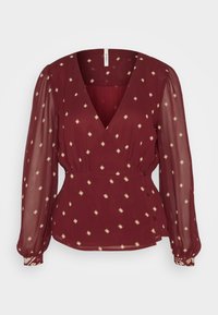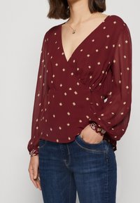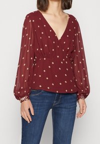 Blouse bordeaux avec un décolleté en V plongeant, manches longues transparentes et imprimé doré en forme de diamant. Fronces à la taille, manches cintrées.